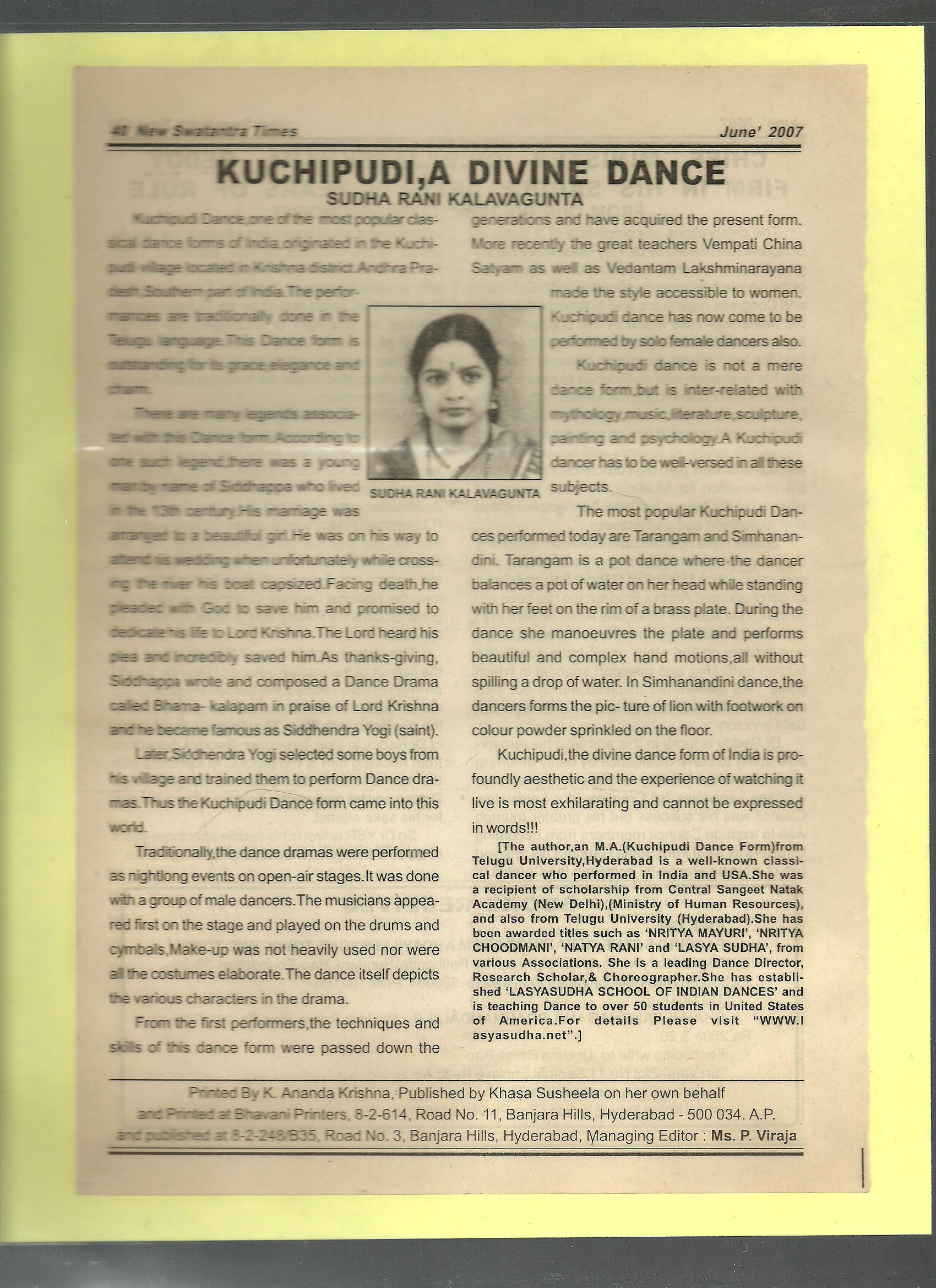 Kuchipudi, A Divine Dance - "New Swatantra Times", June 2007